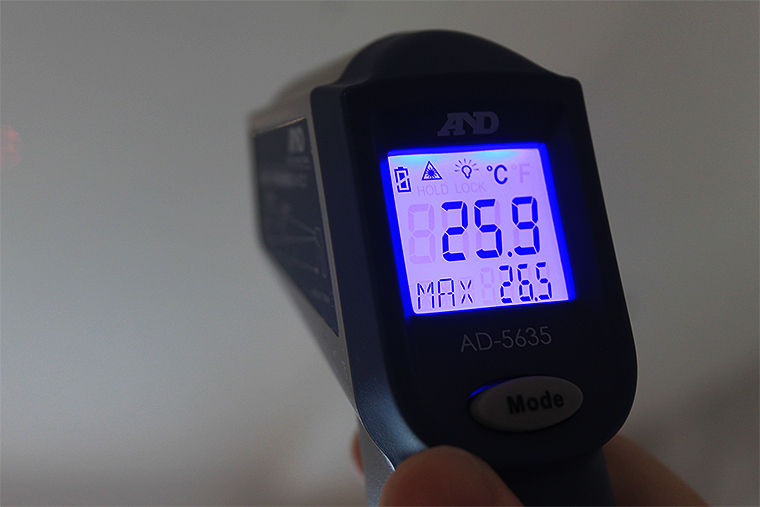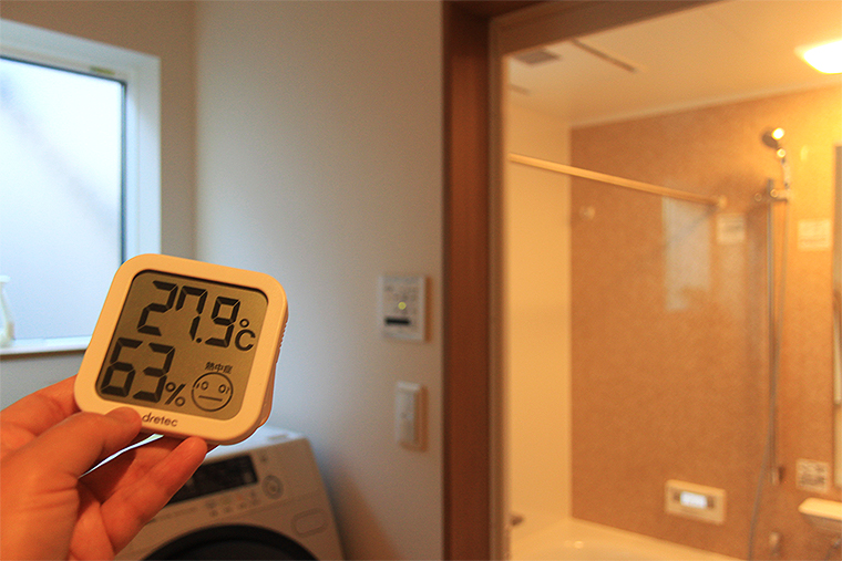 2階は画像のようにほぼ26度。一般的な戸建て住宅では温度が高いといわれる天井でも26.9度。浴室周辺も27.9度をキープしていた。