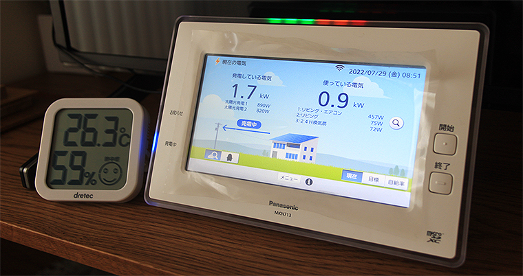 翌朝、午前中の直射日光が差し込み気温がぐんぐん上がっていく酷暑のなか、2階のメインエアコンも26度設定で稼働させていても、屋根につく太陽光パネルで発電している電気が1.7kW、使っている電気が0.9kW(リビングエアコン457W+リビング家電75W+24H換気扇72W)。