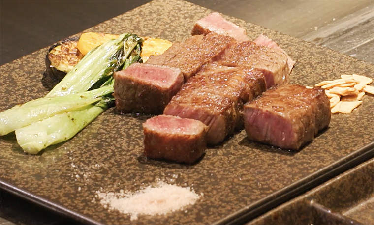 「おいしい!とける~!」 稲垣さんが熟練の技で焼くステーキ(サーロイン・シャトーブリアン)の、噛んだ瞬間にひろがる甘さを味わい、別府の醤油との相性も抜群だったようで、ついにここでも「参りました!」……。