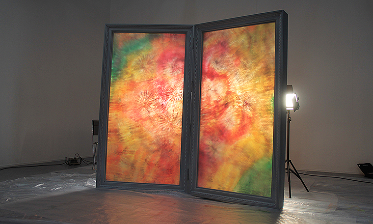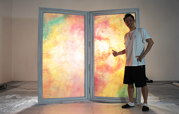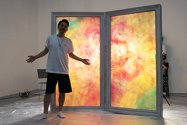 坂東工は8月6日、横浜でラクジュアリー家具を展開する展示空間「Yokohama Bayside Warehouse」で「光の透過による色彩のトリックを仕掛けた屏風」をライブペイントで披露。