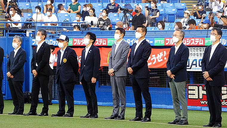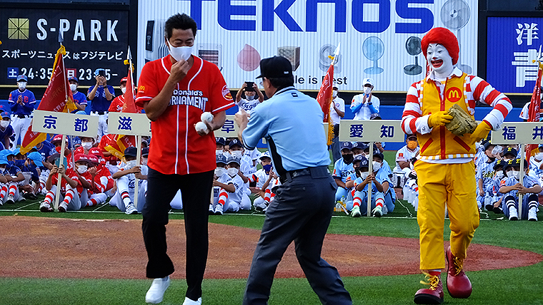 8月8日、神宮球場での開幕式には、全出場チームのほか、全日本軟式野球連盟 武内繁和 会長、特別協賛する日本マクドナルド 日色保 代表取締役社長 CEO などが登壇。