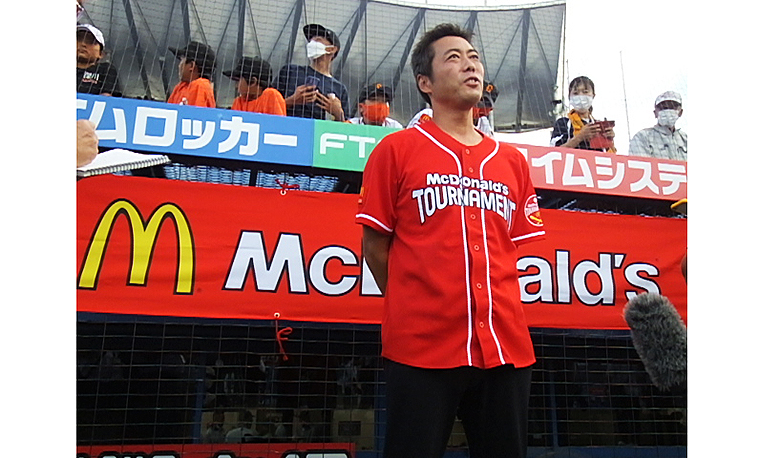 コロナ禍でたいへんでしょうけれども、この全国大会を開催するにあたって、日本マクドナルドさんや関係者のみなさんに、感謝の気持ちを忘れず、監督・コーチ・保護者のみなさん、そして仲間に感謝しながら、野球を楽しんでください。最後まで、がんばってください!」