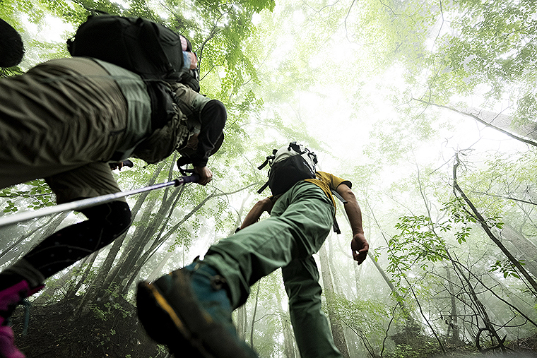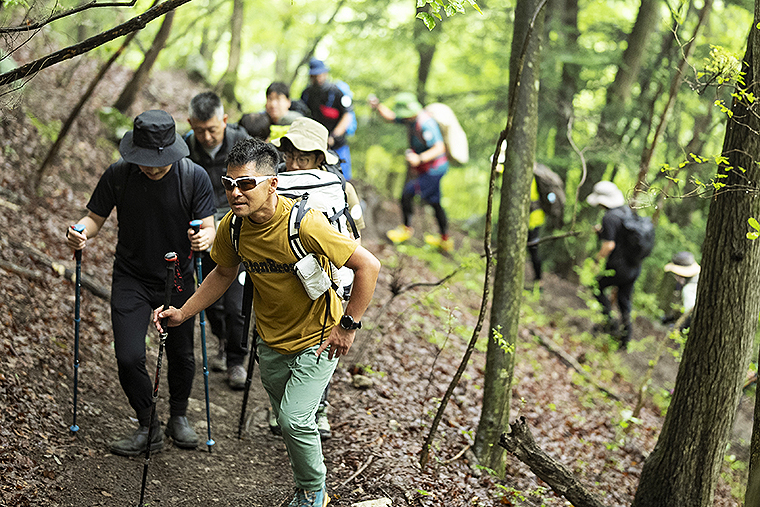 山岳ガイドの水野隆信コーチが参加者たちをリード。標高770メートルの尾白川渓谷駐車場からスタートし、参加者はスマートウォッチのワークアウトモード「ハイキング」をの活用方法をレクチャーしながらトレッキング。