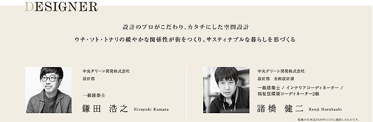中央グリーン開発 設計部 鎌田浩之 一級建築士と、同 諸橋健二 一級建築士は、「内・外・隣りの緩やかな関係性が街をつくり、サスティナブルな暮らしをつくる」という想いでこの「ビー・グレイス南流山 紡ぐ家」を設計したという。