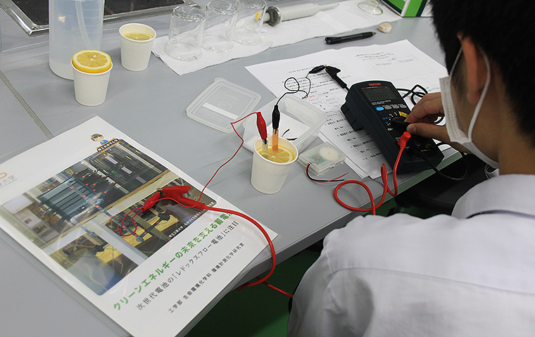 工学部 生命環境化学科「電力を創り出す化学反応の実体験」では、環境計測化学研究室 松浦宏昭 教授といっしょに「食品電池の原理と製作」を実験。参加者はレモンを使ってベストな電極を探り、クリーンエネルギーの未来を体感した。