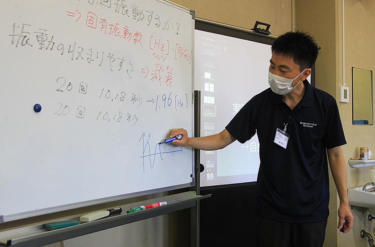工学部 機械工学科「なぜ、地震で建物は壊れるのか?」では、機械力学研究室 皆川佳祐 准教授といっしょに実際に模型を揺らして実験し、揺れの特徴を観察。参加者は実際に固有振動数をチェックしながら、いま注目されている免震・制振技術の基本原理を体感した。