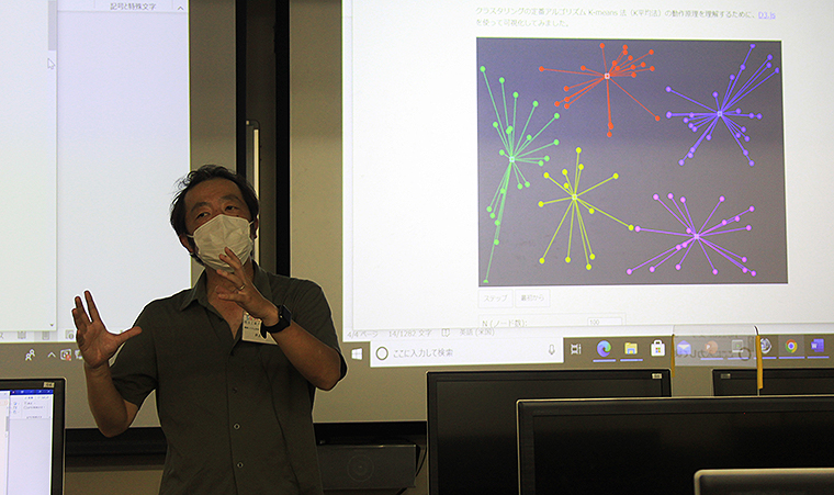 このスクールでは「クラスタリング」というテーマで、生体情報システム研究室 井上聡 教授が解説。参加者はある集合を何らかの規則によって分類できる、k-means法の世界を体感した。