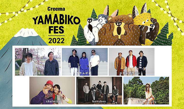 11月5・6日開催 野外フェス「Creema YAMABIKO FES 2022」(クリーマ ヤマビコフェス 2022)第一弾発表アーティストは、「kiki vivi lily」「クラムボン」「くるり」「スチャダラパー」「chelmico」「bonobos」(五十音順)の6組!