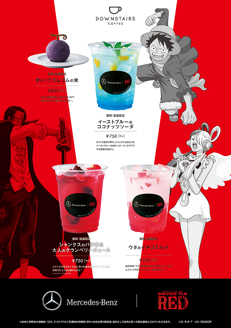 また、メルセデス ミー 東京(六本木)/大阪の「DOWNSTAIRS COFFEE」では、ルフィ、シャンクス、ウタをイメージしたオリジナルメニューを販売。