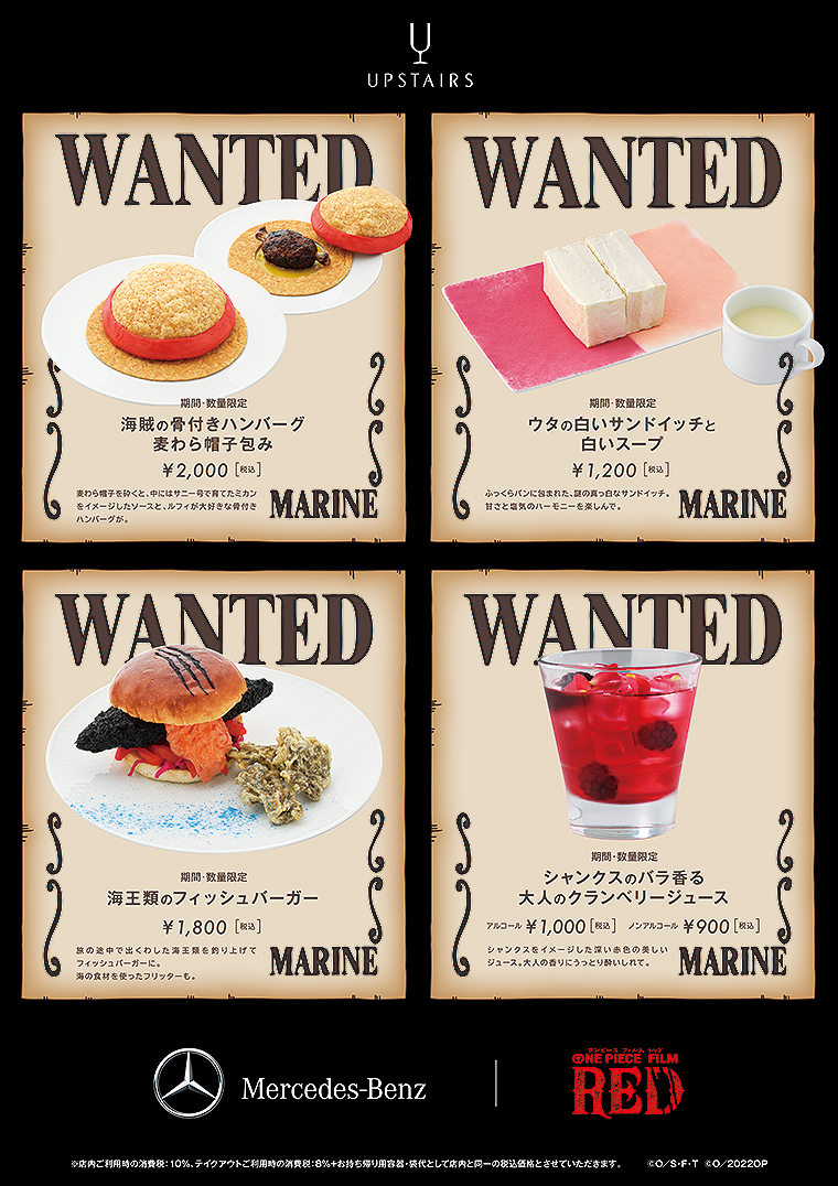 さらにメルセデス ミー 東京(六本木)「UPSTAIRS」では、8月31日まで、『ONE PIECE FILM RED』でも活躍するルフィ、シャンクス、ウタをイメージした、オリジナルフード・ドリンクメニューを販売!