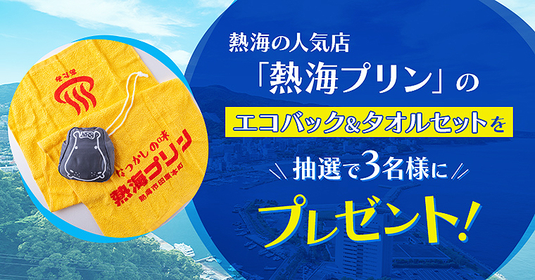 この「auスマプレ調査隊とサイボーグAD飯岡が行く!1万円で楽しむ熱海旅行特集」公開を記念し、auスマートパスTwitter(@smartpass_au)をフォローし、投稿される対象のツイートをリツイートした人のなかから抽選で3名に、熱海の人気店「熱海プリン」のエコバッグ&タオルセットをプレゼント!