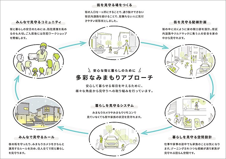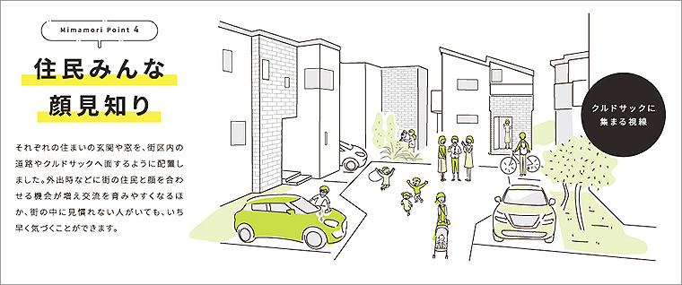 住まいの玄関や窓を、街区内の道路やクルドサック(袋小路)へ面するように配置し、外出時などにほかの住民と顔を合わせる機会が増え、交流を育むことで街全体の防犯意識も向上する。街の中に見慣れない人がいても、いち早く気付けるといったメリットもある。