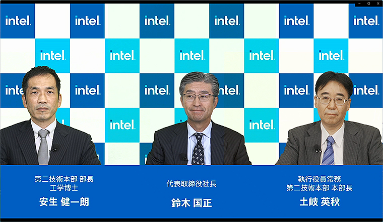 その発表会には、インテル 鈴木国正 代表取締役社長、土岐英秋 執行役員常務 第二技術本部 本部長、安生健一朗 第二技術本部 部長 工学博士が登壇。