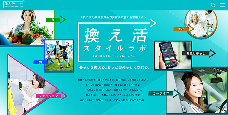 同サイトでは、換え活に関するヒントや最新情報、「旅」「エンタメ」「カーライフ」「食」「ファッション」「コミュニケーション」「健康と美」といったカテゴリごとの換え活情報などをラインナップ。