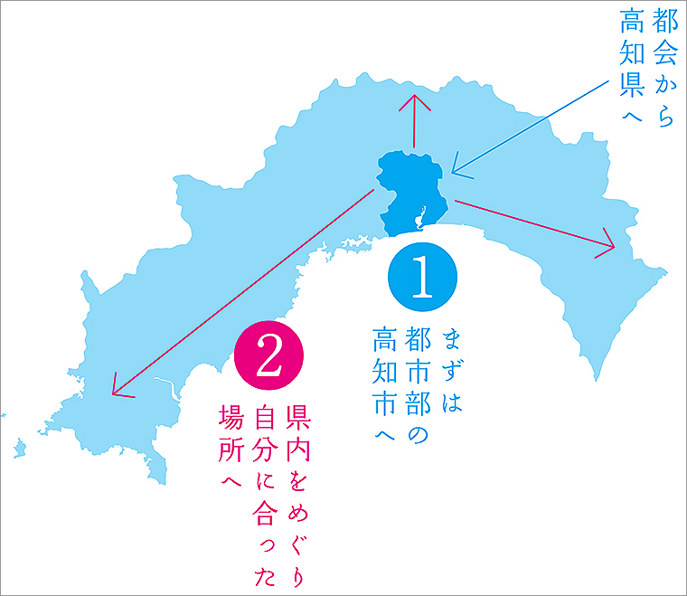 「いきなり田舎暮らしをはじめるのではなく、まずは比較的都市部の高知市に移住・滞在(1ステップ)。そこを拠点に高知県内をめぐり、自分に合った場所を見つけたのち、安心して最終的な移住(2ステップ)を決めるのは、どう?」