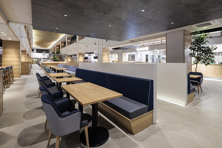 1~2階は吹き抜け構造となっており、見上げれば約70メートルの波形天井が目に入る大空間に。岡山名産の「デニム」をふんだんに使用した椅子など、瀬戸内の自然や特産品から着想を得たデザインが多く採用されています