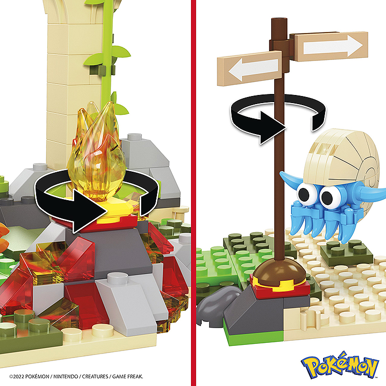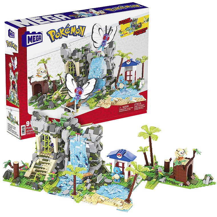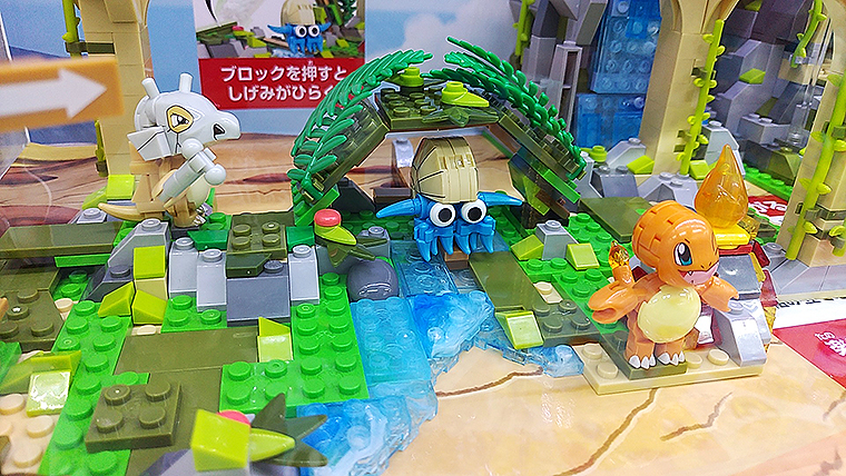 1362ピースのブロックで、滝のある岩山や洞窟、ビーチや森を組み立てて、壮大なポケモンの世界を再現できるスペシャルなブロックセット。