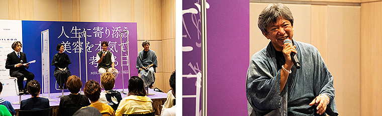そして、女性初のテーラー・オーダーメイドスーツのブランドを経営する勝友美さん、納棺師として人生の最期の瞬間に寄り添ってきた吉永直樹さん、看護師として患者さんの健康に寄り添ってきた森山佐恵さん、美容業界ではなく他業種で人の人生に寄り添ってきた3人に「人生に寄り添う」をテーマにトーク。