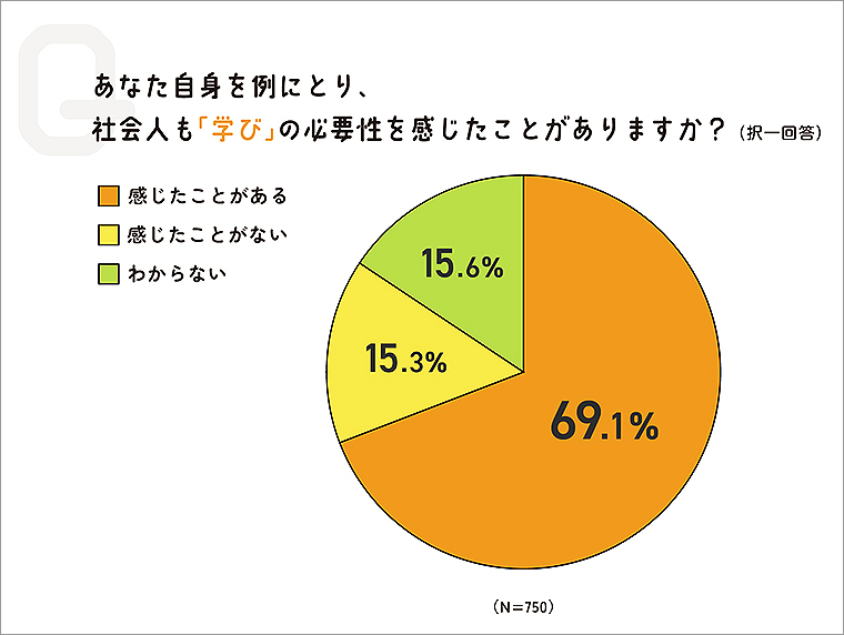 「社会人も学びの必要性を感じたことがありますか」という問いに対し、全体の69.1%が「学ぶ必要がある」という結果に。