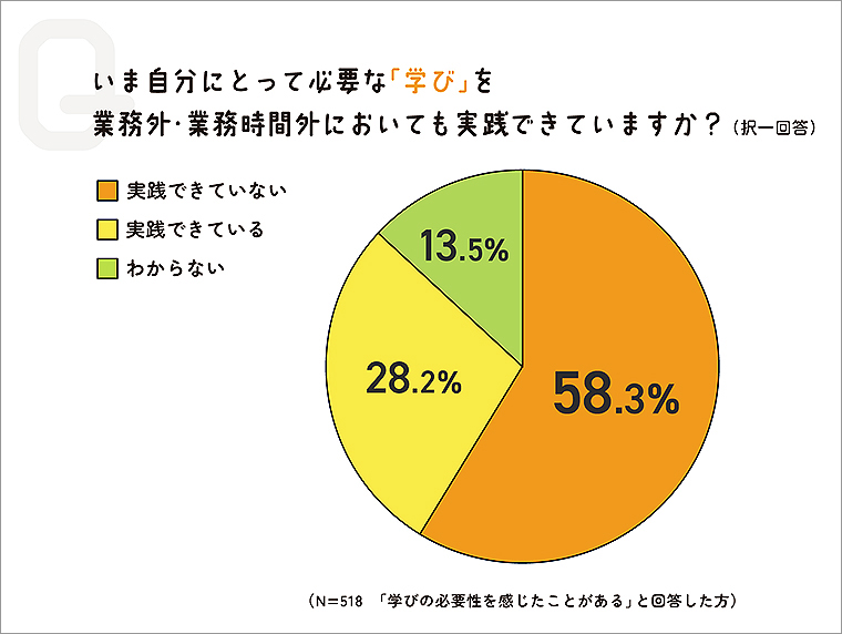 いっぽう、そのうち「必要な学びを実践できていない」は58.3%に。多くの若手社会人が学びの必要性を感じつつも、実際には取り組めていないという事実が見えてきた。