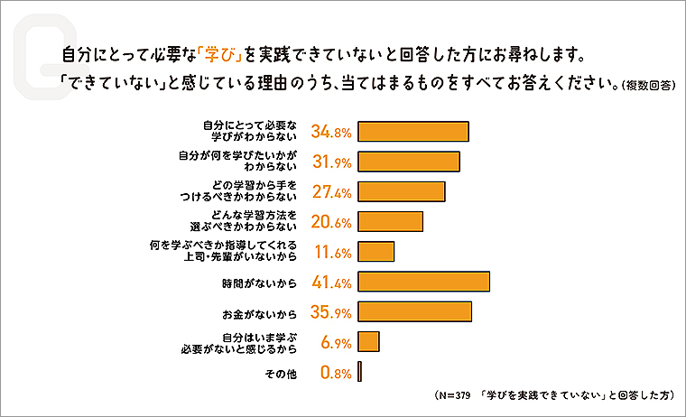 「学びを実践できていないと感じる理由」についての問いに対し、「時間がないから」「お金がないから」を除くと、「自分にとって必要な学びがわからない」が34.8%で最も多い結果に。