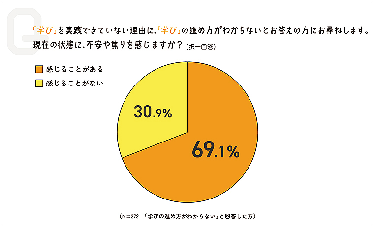 また、学びが実践できてない理由として、「時間がない、お金がないから」といった“王道的”な理由に続いて、「自分にとって必要な学びがわからない」「何が学びたいかわからない」が多く挙げられました。