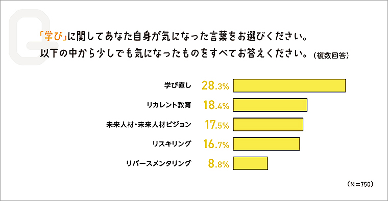 「学びに関して気になった言葉」については、「学び直し」が28.3%で1位。次いで「リカレント教育」が18.4%で2位。