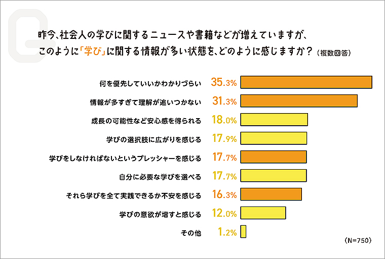 また、「学びに関する情報が多いことをどう思うか」という問いに対しては、「何を優先していいかがわかりづらい」が35.3%、「情報が多すぎて理解が追いつかない」が31.3%で、焦りが感じられる結果となった。