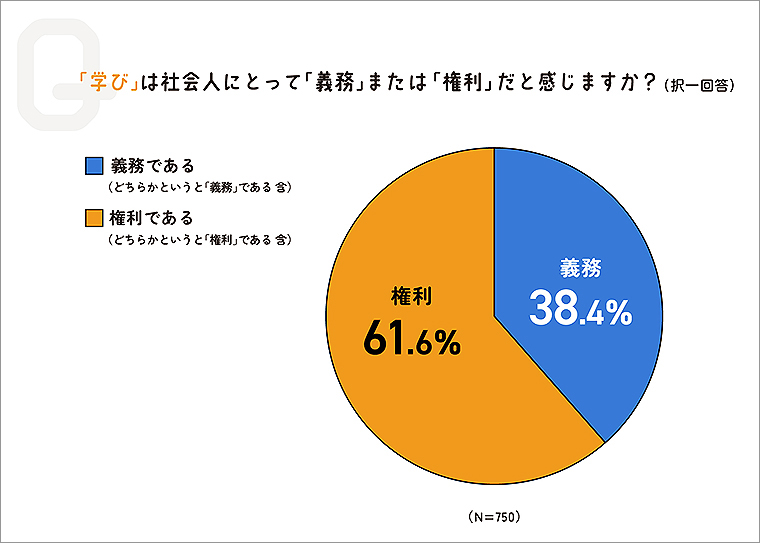 「学びを義務だと思うか、権利だと感じるか」という問いに対し、「権利」と回答した人が61.6%。