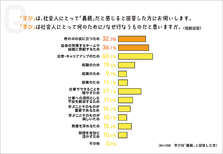 学ぶ理由として目立った特徴は、「義務」と回答した方は、「権利」と回答した人と比較し、「自身の所属するチームや組織に貢献するため」が16.6ポイント、「世の中の役に立つため」が8.9ポイント上回るなど「世の中のため・周囲のため」に学ぶ傾向が見られた。