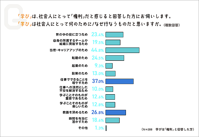 「権利」と回答した人は「仕事でできることを増やすため」「教養を深めるため」という回答が多かった。