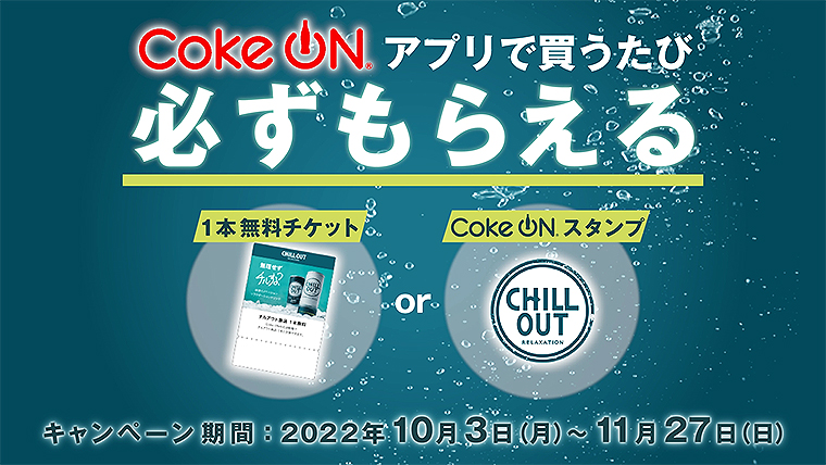 ■参加方法:コカ・コーラ公式アプリ「Coke ON」を、「Coke ON」対応自販機に接続して、CHILL OUT リラクゼーションドリンクを購入