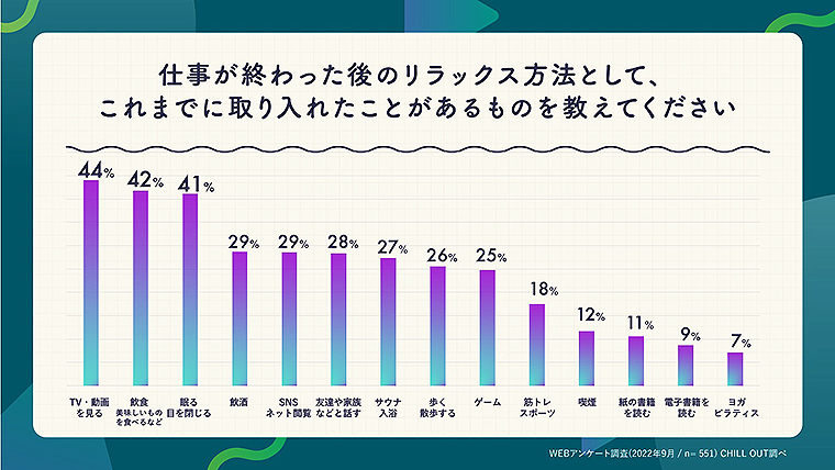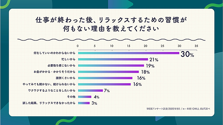 さらに約44%の人が「仕事終わりのリラックス習慣はとくにない」と回答しており、うち4人に1人が「何をしていいかわからない」と回答した。