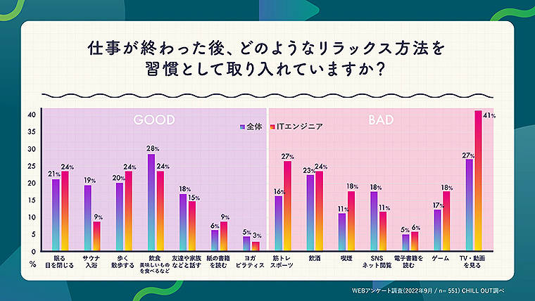 そんな CHILL OUT リラクゼーションドリンク が開設した特設サイト「チルするすゝめ」(https://butfirstchillout.com/special/susume/)が、仕事終わりにリフレッシュするためのさまざまな方法を掲載するなどで、いま注目を集めている。