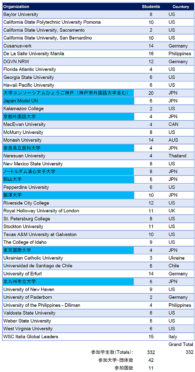 ―――コロナ禍後初となる米国外での大会、6年ぶり2回目の開催で神戸市外国語大学がホストを務める今回の模擬国連世界大会は、下記のようなスケジュールと参加者で実施される。