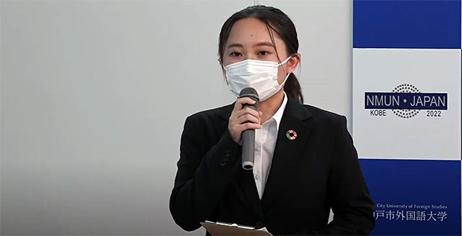 会議本番では各国の特長をとらえつつも、神戸市外国語大学らしい、外交的で国際協調を促せる大使として活躍したいと考えています」(松下巴南 大使役)