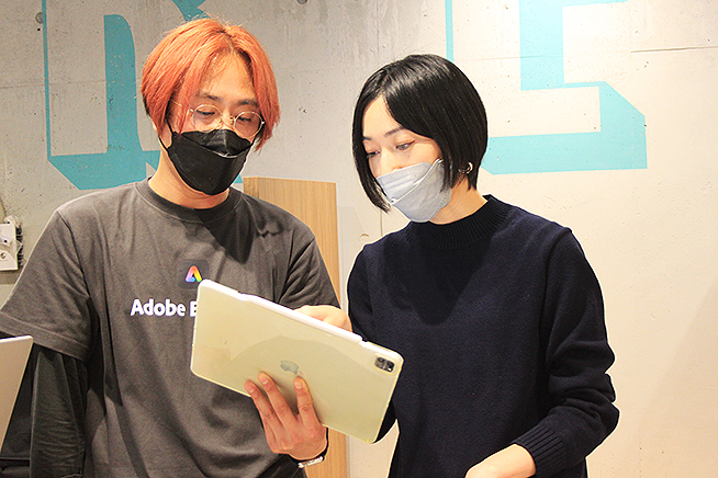 ログイン後にさまざまなテンプレートからお気に入りのデザインを選択し、テキストやキャッチコピーを入力、レイアウトも指先ひとつで変更できるなど、Adobe Express ならではの操作性を伝授。「Canvaよりも直感的で楽しい」とも教えてくれた。