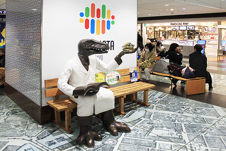 東京駅 構内 地下1階場所 スクエア ゼロには、恐竜王国 福井の世界が体感できる実物大 恐竜頭骨(レプリカ)や、恐竜博士も登場。