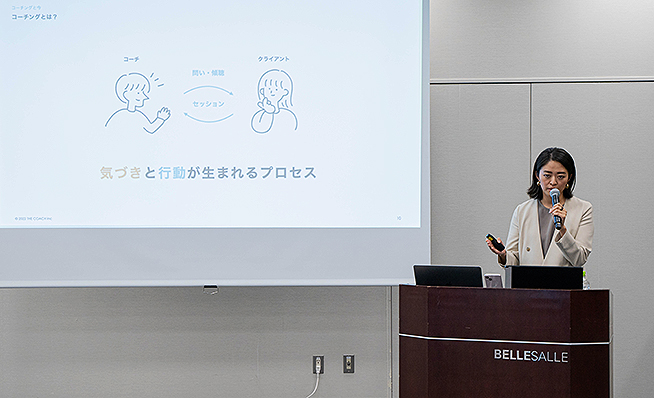 「コーチングとは、コーチとクライアントの間で気づきと行動が生まれるプロセス。日常のなかで立ち止まり、気づきと行動を得ていくプロセスを通じて自分らしいリーダーシップを築いていくアクションです。
