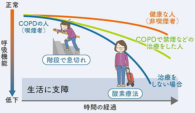 COPD(慢性閉塞性肺疾患)の治療は、禁煙が基本。禁煙と薬による治療で、症状や呼吸機能の低下を抑えられる。
