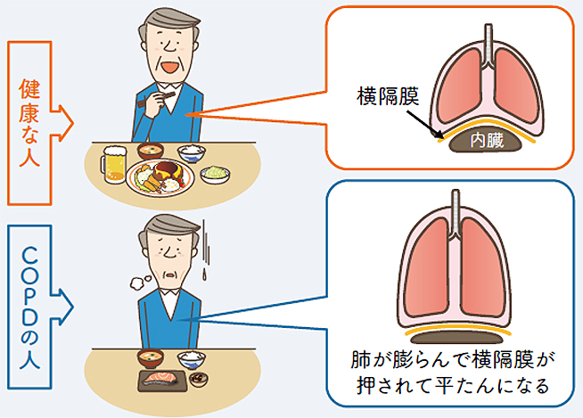 「COPDの患者さんの肺は、息をうまく吐き出せず膨らんでいるため、その下にある胃が圧迫され食欲があまりわきません。
