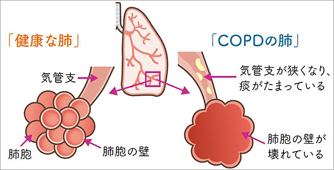肺に炎症が起きると空気の通り道である気道や気管支が狭くなったり、気管支の先のぶどうの房状の肺胞が壊されたりして、呼吸機能が低下していく。