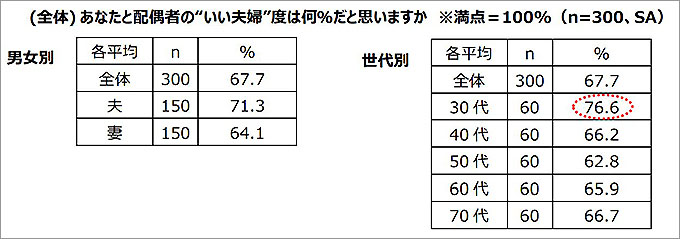 さらに、配偶者との “いい夫婦”度は何%だと思うか聞いたところ、全体の平均67.7%、夫の平均71.3%、妻の平均64.1%と、夫の方が妻よりも“いい夫婦“度の評価が多少高いことがわかった。