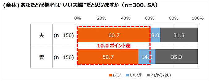 自分たち夫婦は “いい夫婦“だと思っている夫60.7%、妻50.7%。自己採点 “いい夫婦“度は平均67.7%