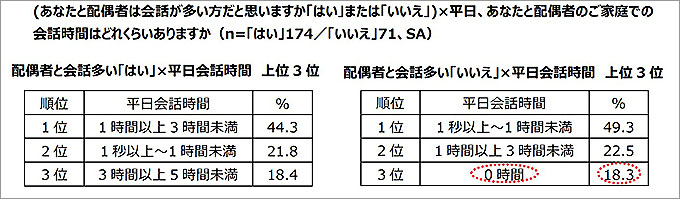 さらに、3位は「0時間」(18.3%)という結果から、会話が少ないと認識している夫婦の約2割は、平日は会話がないという実態も明らかに。