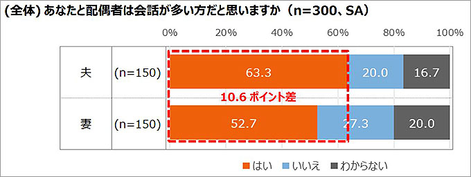 中小企業経営者150名と中小企業経営者の妻150名に、配偶者との会話が多い方だと思うか聞いたところ、「はい」と回答したのは、夫63.3%、妻52.7%で、男女で10.6ポイントの差があり、夫の方が妻よりも会話が多いと感じている人が多いことがわかった。