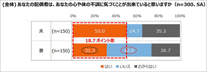 また、配偶者があなたの心や体の不調に気づくことが出来ていると思うか聞いたところ、「はい」と回答したのは、夫50.0%、妻31.3%で、男女で18.7ポイントの差があった。