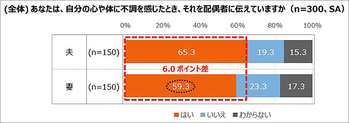さらに、気になる点は、「いいえ」と回答した妻42%と、約4割の妻が、夫は妻の不調に気づけていないと思っていた。