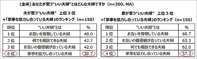 特に男女で大きな差があったのが、全体では4位の「家事を協力し合っている夫婦」(全体44.0%)で、夫30.7%に対して、妻57.3%と26.6ポイントの差があり、順位にも4位と6位と差があった。