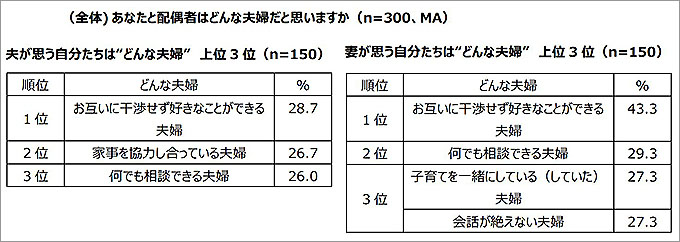 さらに、あなたと配偶者はどんな夫婦だと思うか聞いたところ、全体では1位「お互いに干渉せず好きなことができる夫婦」(全体36.0%、夫28.7%、妻43.3%)、2位「何でも相談できる夫婦」(全体27.7%、夫26.0%、妻29.3%)、3位「会話が絶えない夫婦」(全体26.3%、夫25.3%、妻27.3%)という結果に。